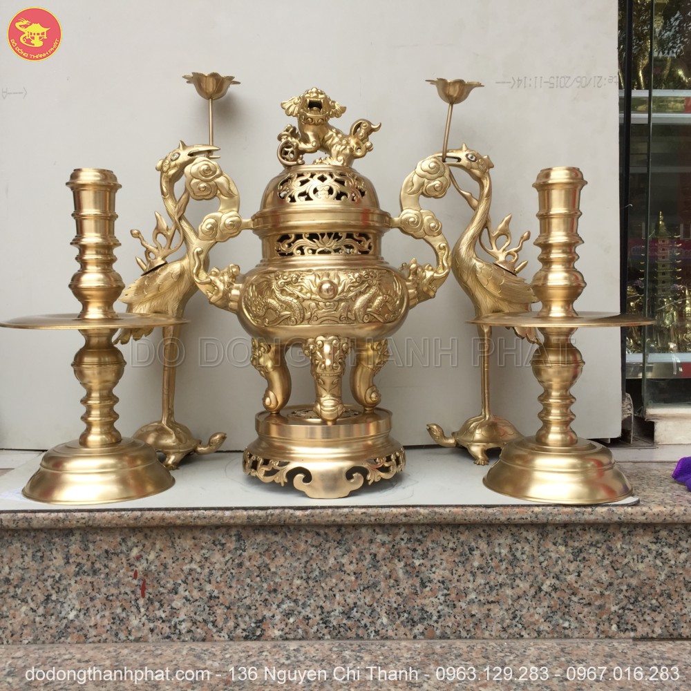 Bộ đồ thờ cúng bằng đồng liên doanh được sản xuất dây chuyền có màu vàng sáng bóng, nhìn bắt mắt, thẩm mỹ cao, phù hợp đối với phong tục thờ cúng ở Miền Nam và Miền Tây.