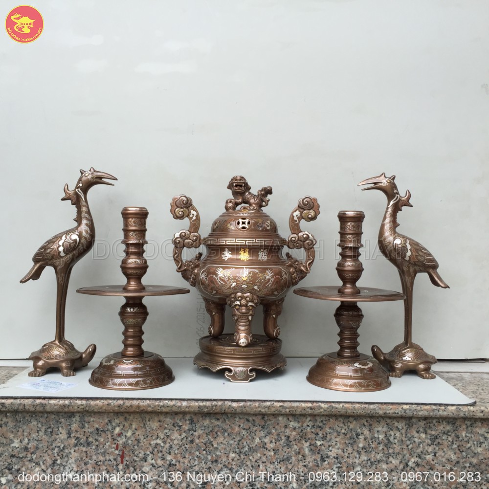 Bộ ngũ sự bằng đồng bao gồm có 5 vật đó là đỉnh đồng, hạc đồng và đôi chân nến đồng.